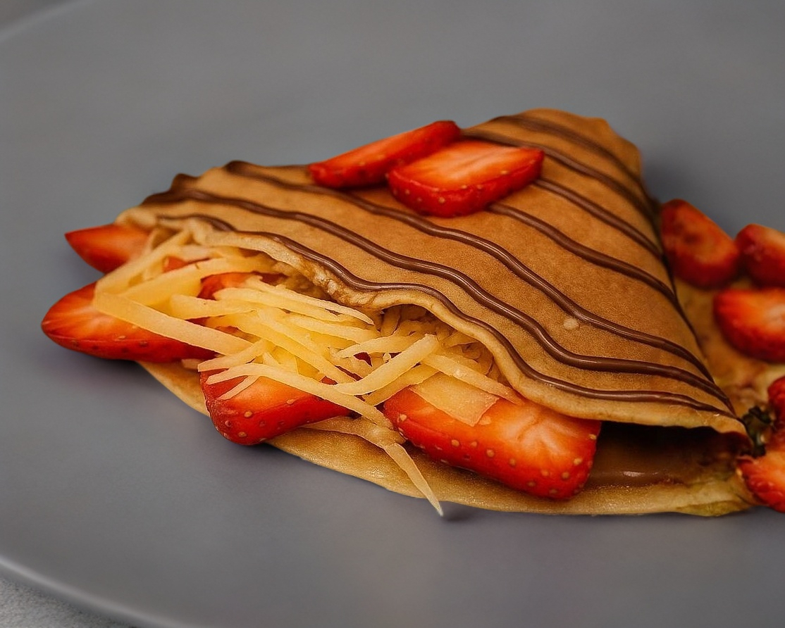 Deliciosa crepa/waffle relleno tus quesos favoritos, por fuera, un toque aderezo chipotle!, elige la masa que más te guste crepa o waffle, acompaña con una deliciosa bebida con tapioca.