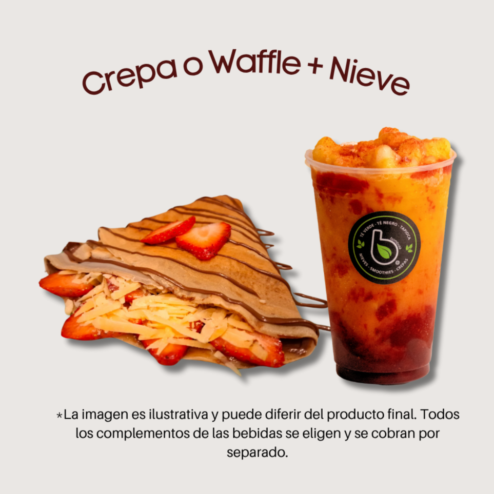 Incluye una crepa o waffle + una nieve (bebida a base de agua sabor frutal). Sabores, toppings y complementos se eligen al armar tu pedido y se cobran por separado. Ideal para un antojo dulce con tu bebida favorita.
