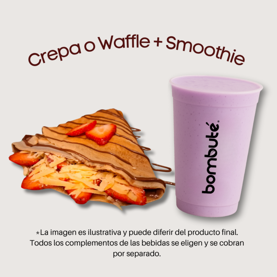 Incluye una crepa o waffle + un smoothie. Sabores, toppings y complementos se eligen al armar tu pedido y se cobran por separado. Ideal para un antojo dulce con tu bebida favorita.