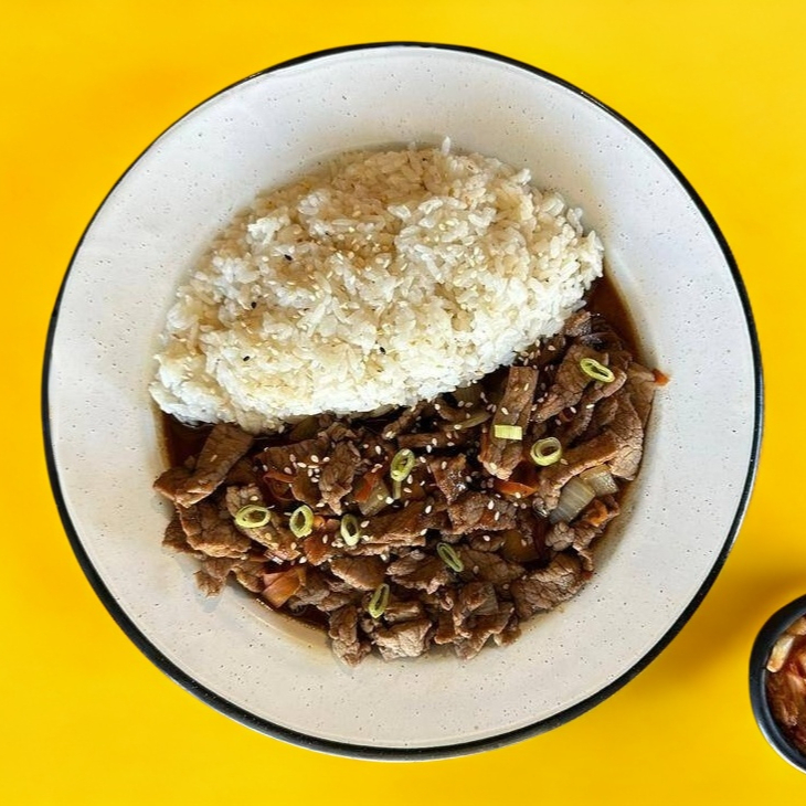 Arroz, bulgogi, zanahoria, cebolla, cebolla cambray, ajonjolí servido con arroz y kimchi.