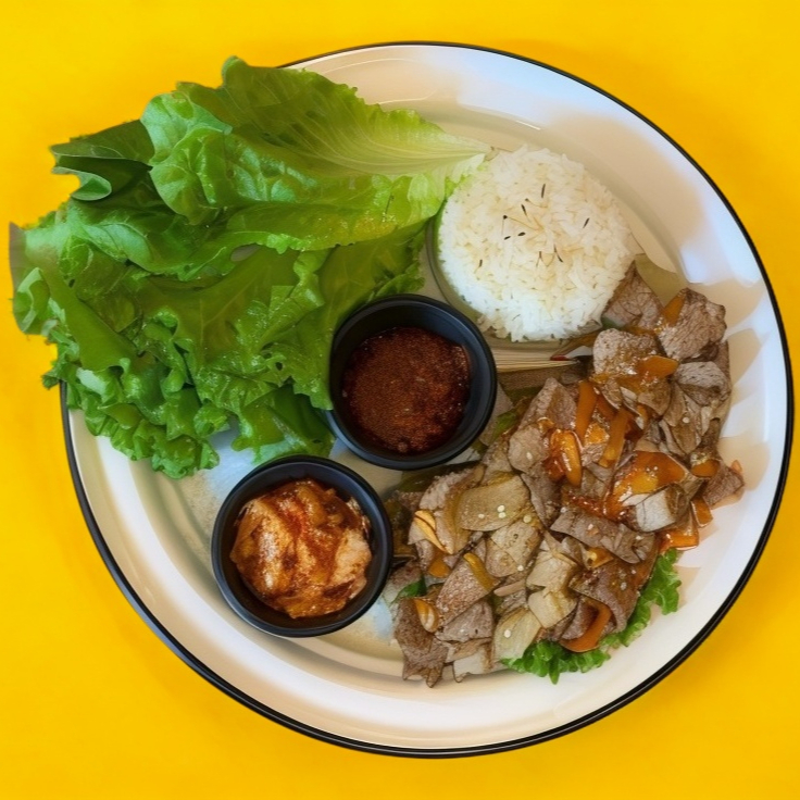 Carne de Bulgogi de res estilo coreano, champiñones, zanahoria, cebolla, lechuga y huevo. Servido con salsa de soya Gochujang.
