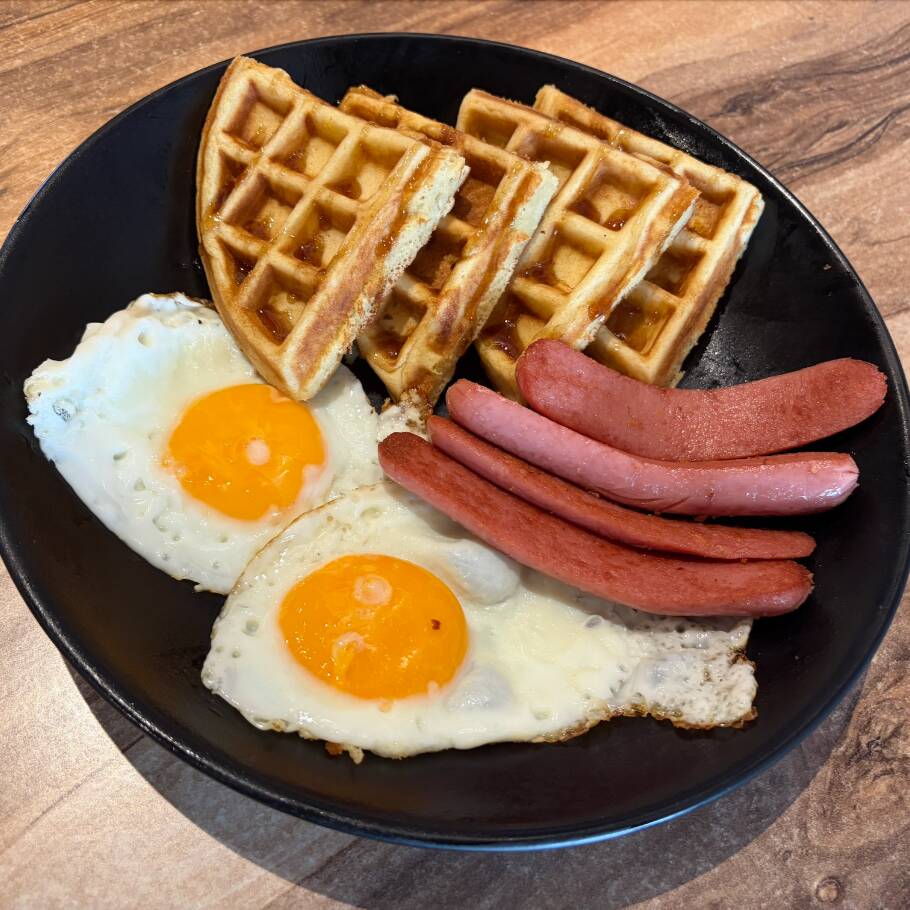 Waffle con dos Huevos acompañado con salchicha partida.