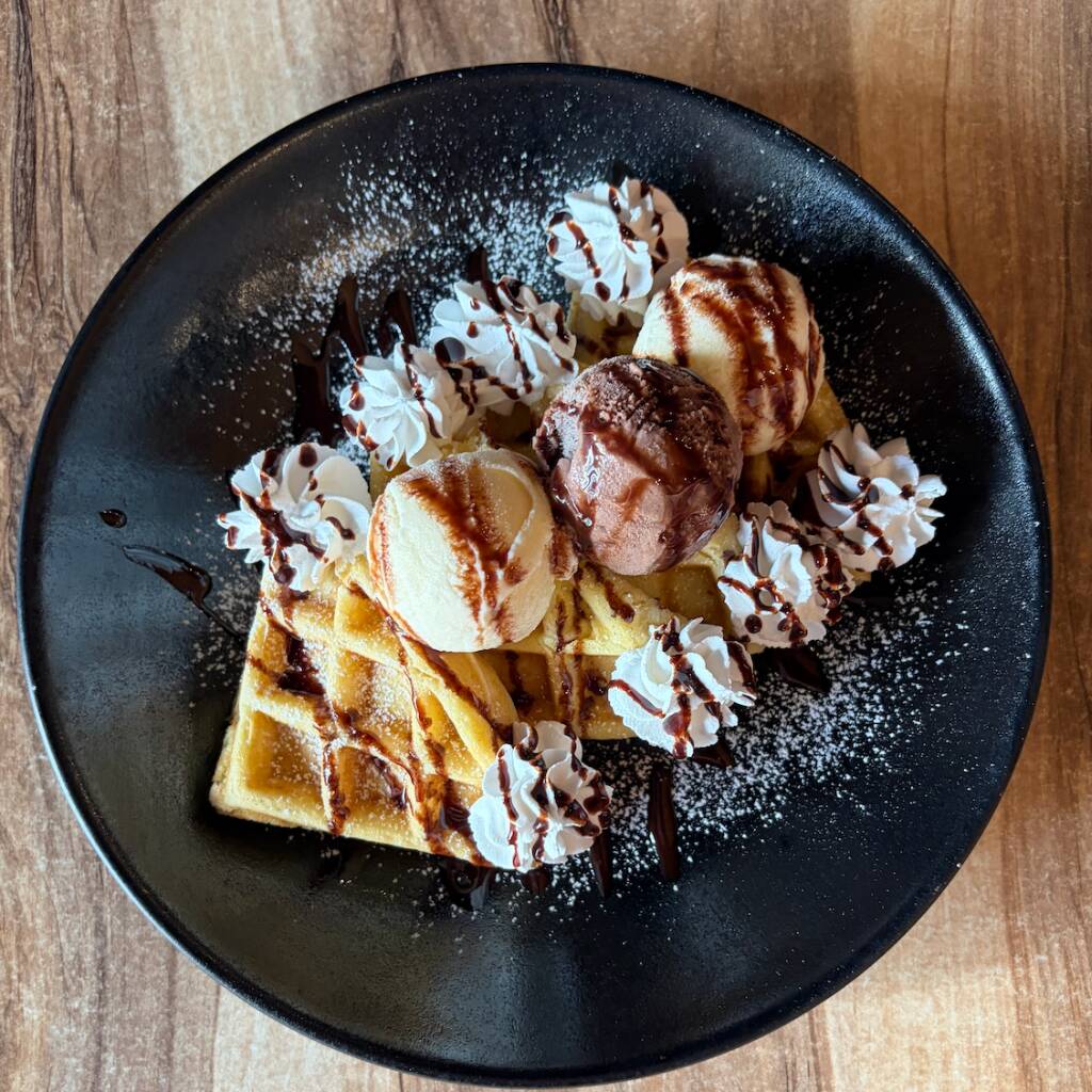 Waffles con Nutella, plátano, crema batida, helado de vainilla, jarabe de chocolate y azúcar glass.