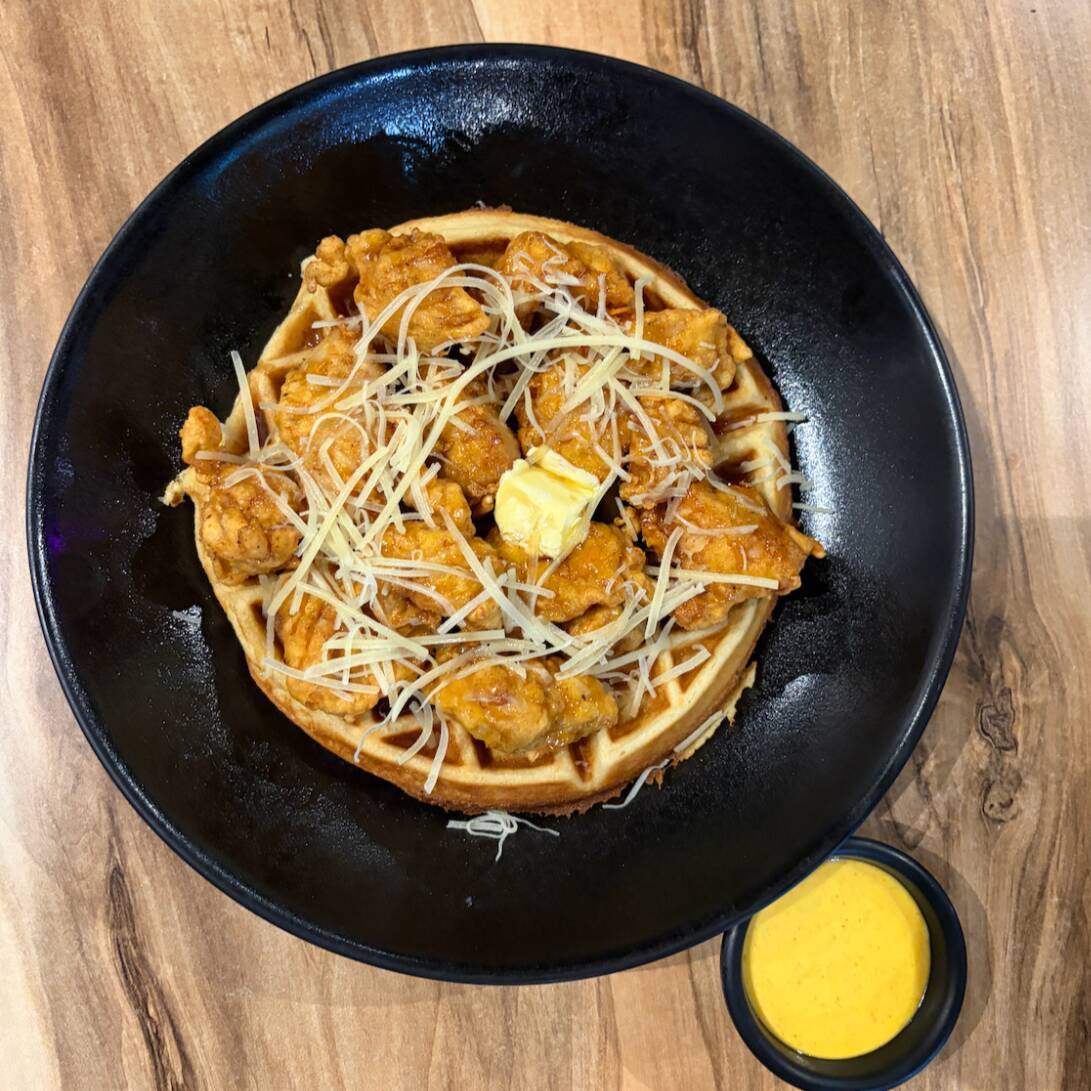 Pollo frito marinado en buttermilk, colocado en un waffle, acompañado de queso parmesano rallado, cubito de mantequilla y aderezo Mostaza dulce.