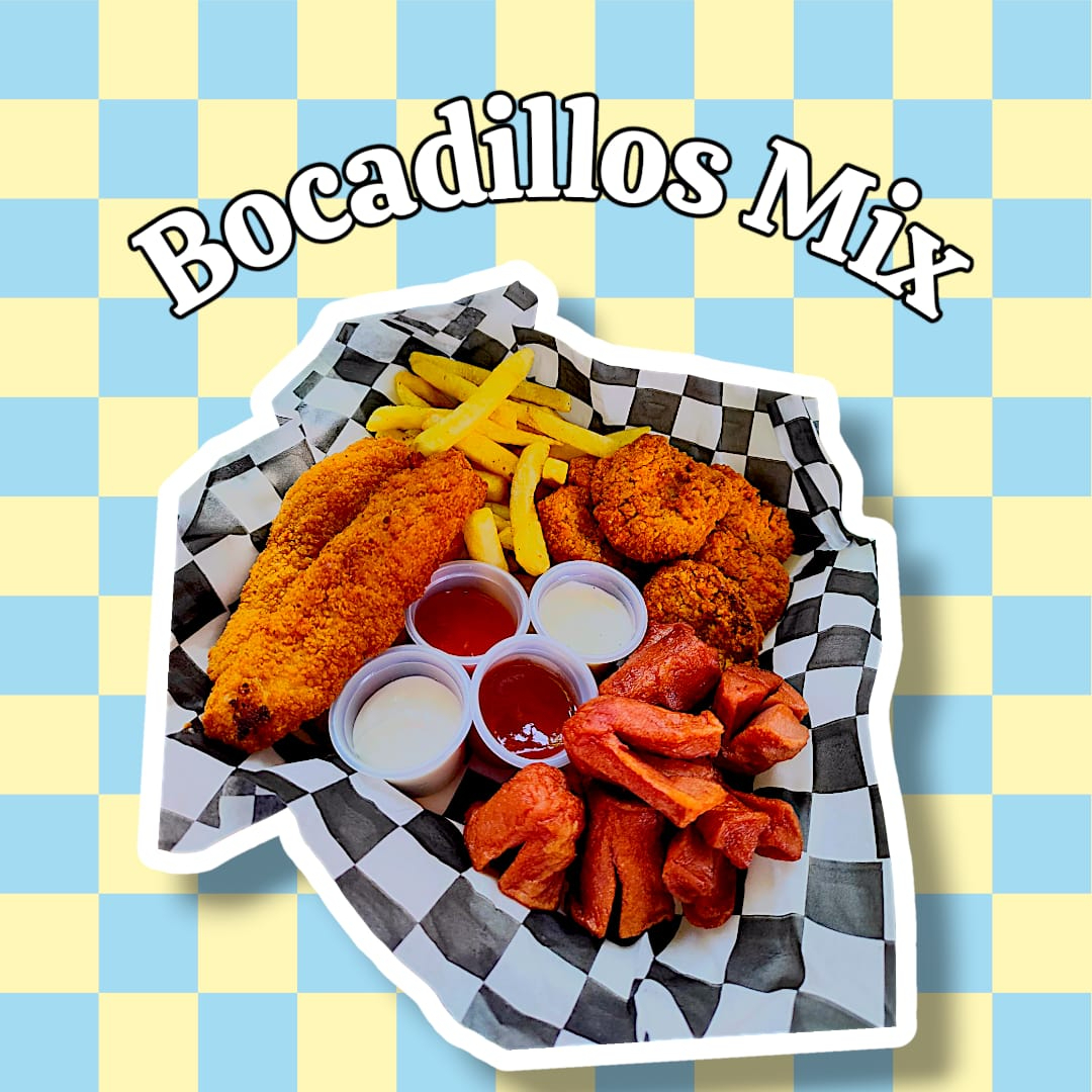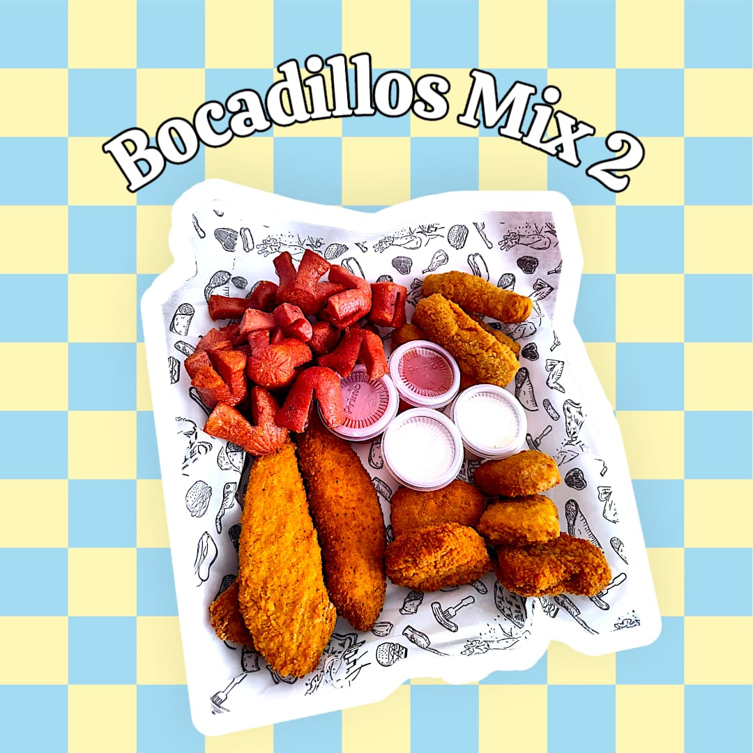 Bandeja de bocadillos con 4 porciones Mixeadas de Tenders, Salchipulpos, Nuggets y Dedos de queso, complementados con 4 aderezos de su elección.