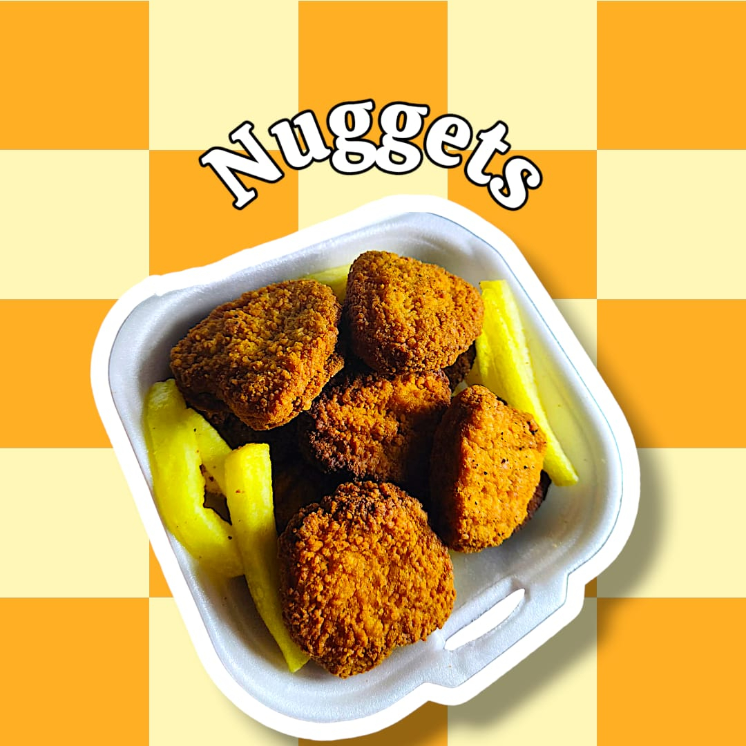 Nuggets crujientes, acompañados de una cama de papas a la francesa, complementadas con 3 aderezos de su elección.