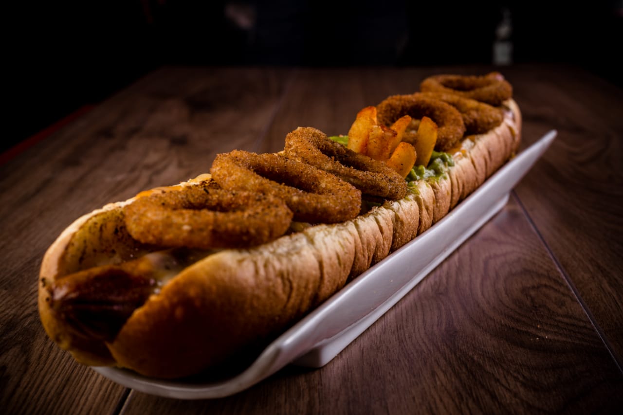 Salchicha de 30 cm con un toque a chipotle, aros de cebolla y guacamole, en pan artesanal.