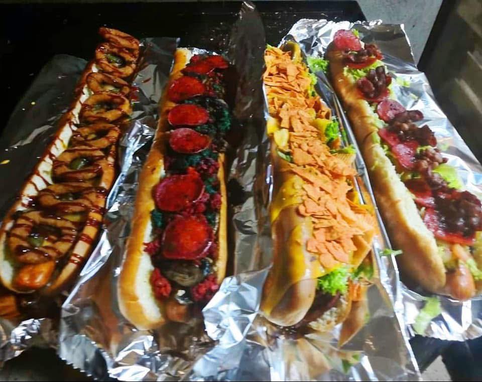 Hot dog con chorizo rojo y verde, tocino, champiñones y pepperoni.