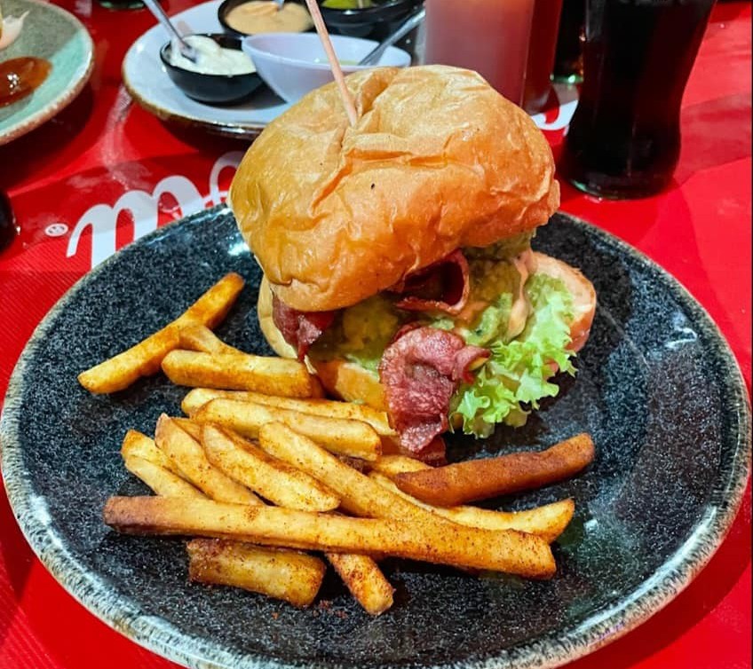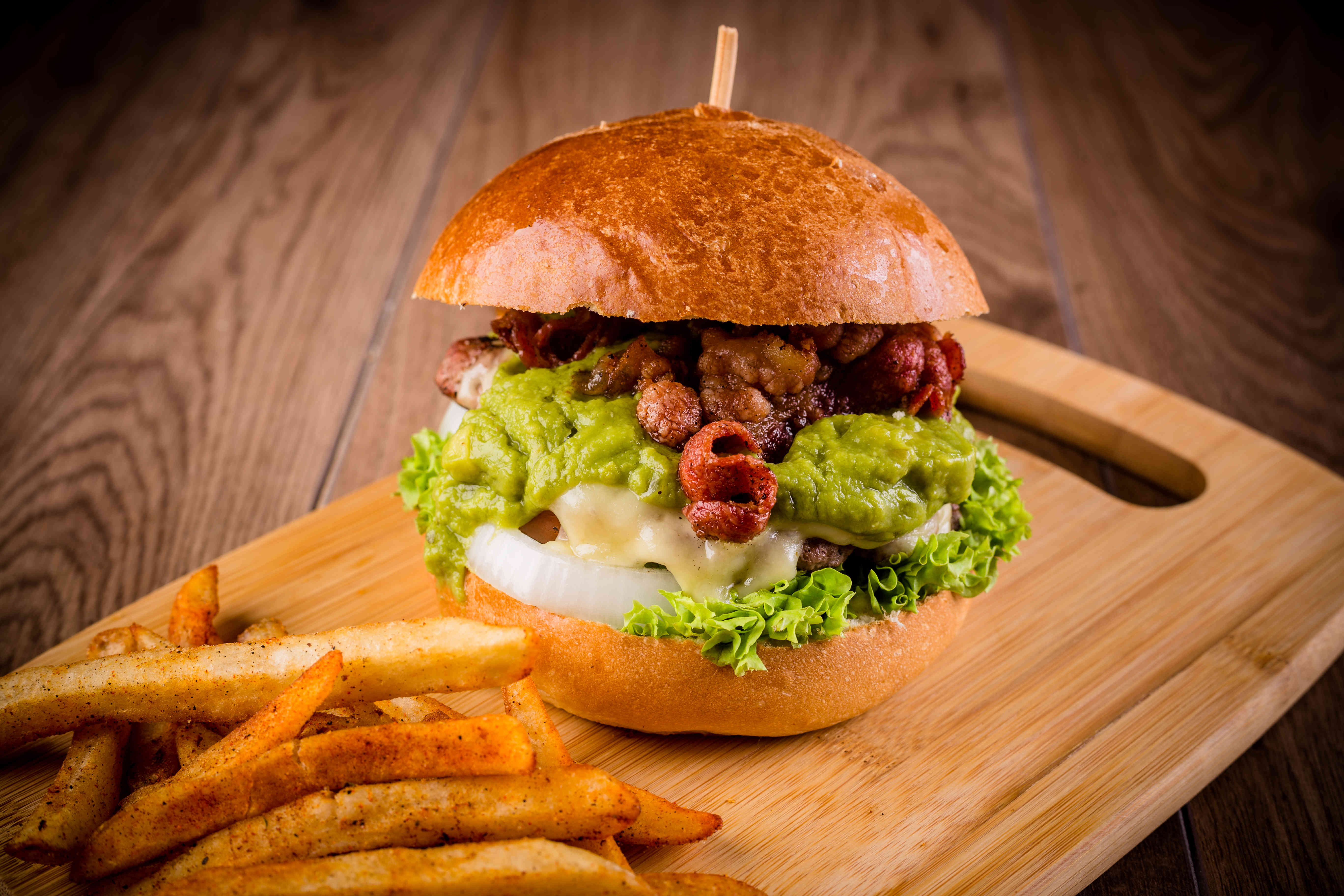 180 g De carne hecha a mano 100% Angus, queso gouda, guacamole y crujiente tocino en pan brioche artesanal.