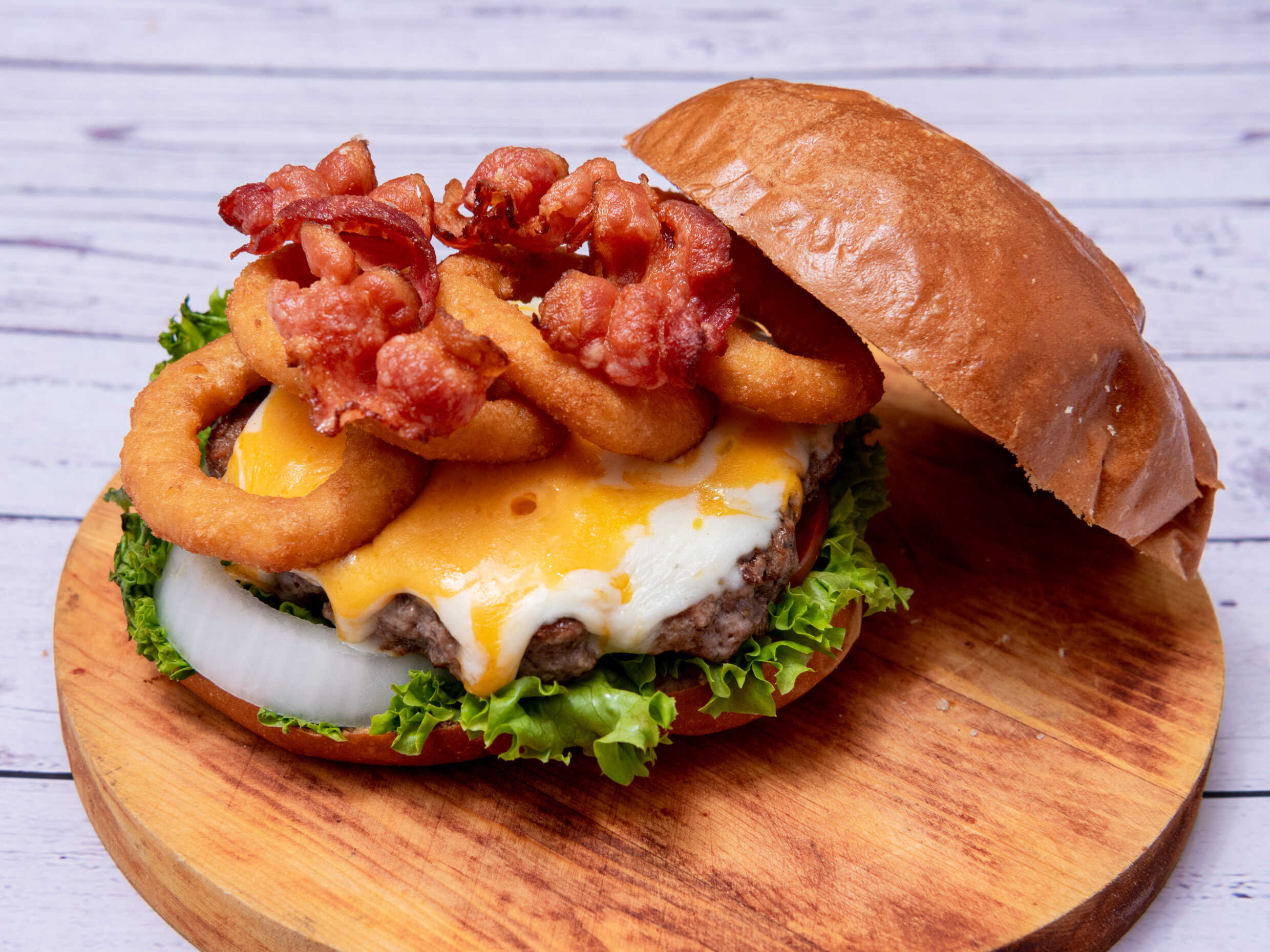 carne hecha a mano 100% Angus, queso cheddar y monterrey, aros de cebolla y crujiente tocino en pan brioche artesanal.