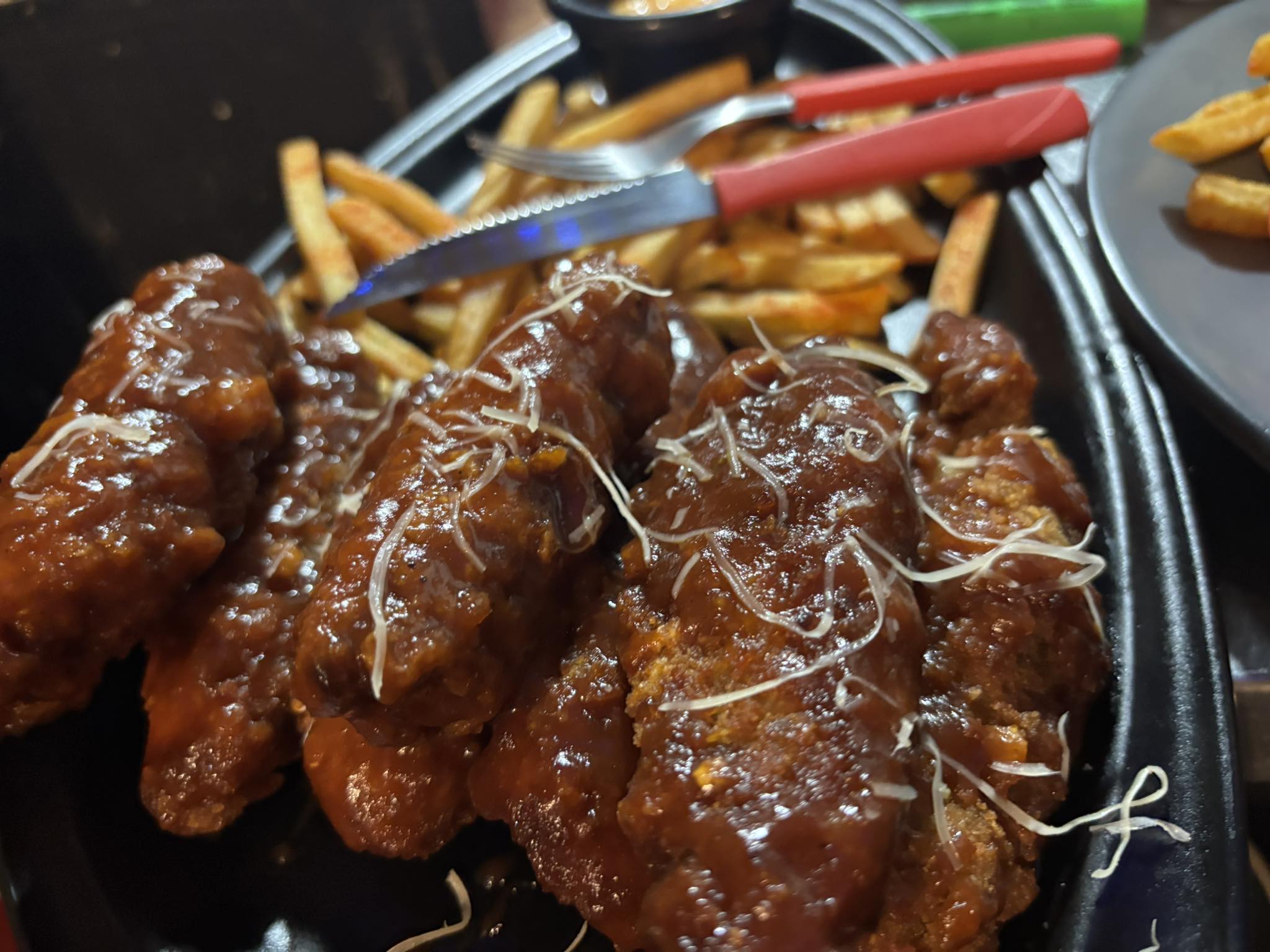 Porcion de papas francesa con bites de pollo bufalo con queso gratinado, blue cheese y queso cheddar amarillo.