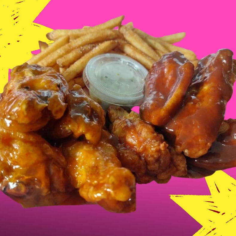 8pz de alitas bbq 1 porcion de ranch incluye una orden pequeña de papas a la francesa