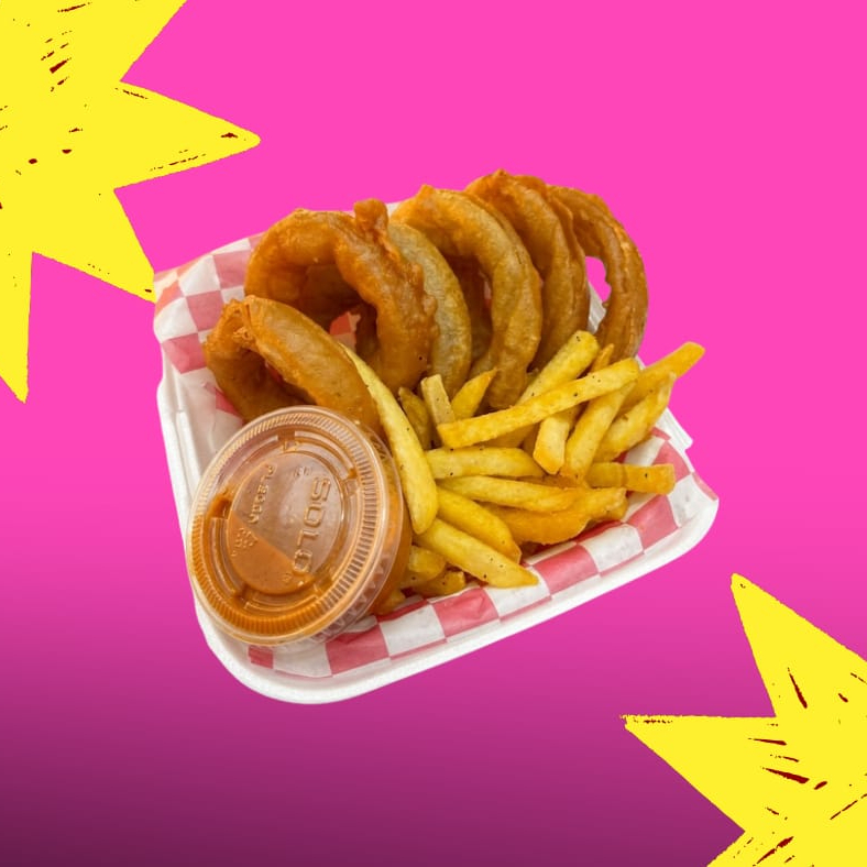 Hamburguesa de res, aros con bbq , queso, cebolla, lechuga, mayonesa y catsup. incluye papas