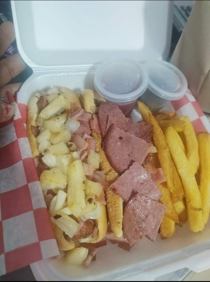 Carne de res, jso, pepinillos y vegetales más porción de papas.amón, que