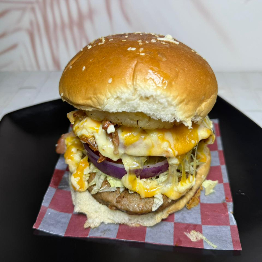 Carne a elegir, queso cheddar, salsa BBQ, y 2 tiras de tocino premium, jamón, romanita, cebolla roja, 1 rebanada de tomate, mayonesa y cátsup y 100 g de papas a la francesa.