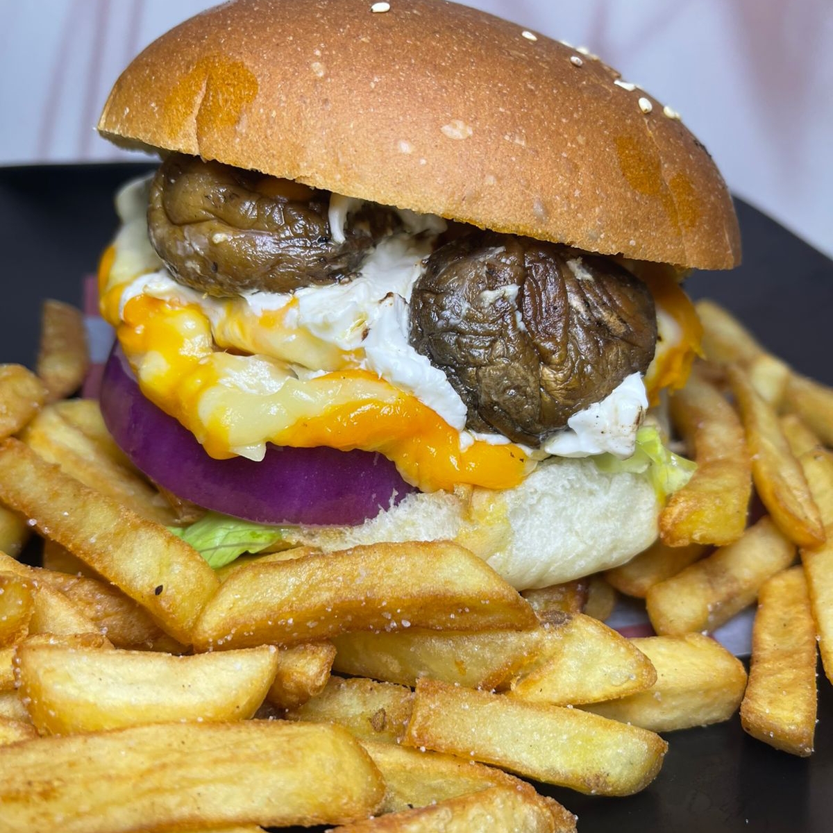 Carne a elegir, champiñones rellenos de queso crema, jamón, cebolla roja, 1 rebanada de tomate, romanita, cátsup, mayonesa y 100 g de papas a la francesa.