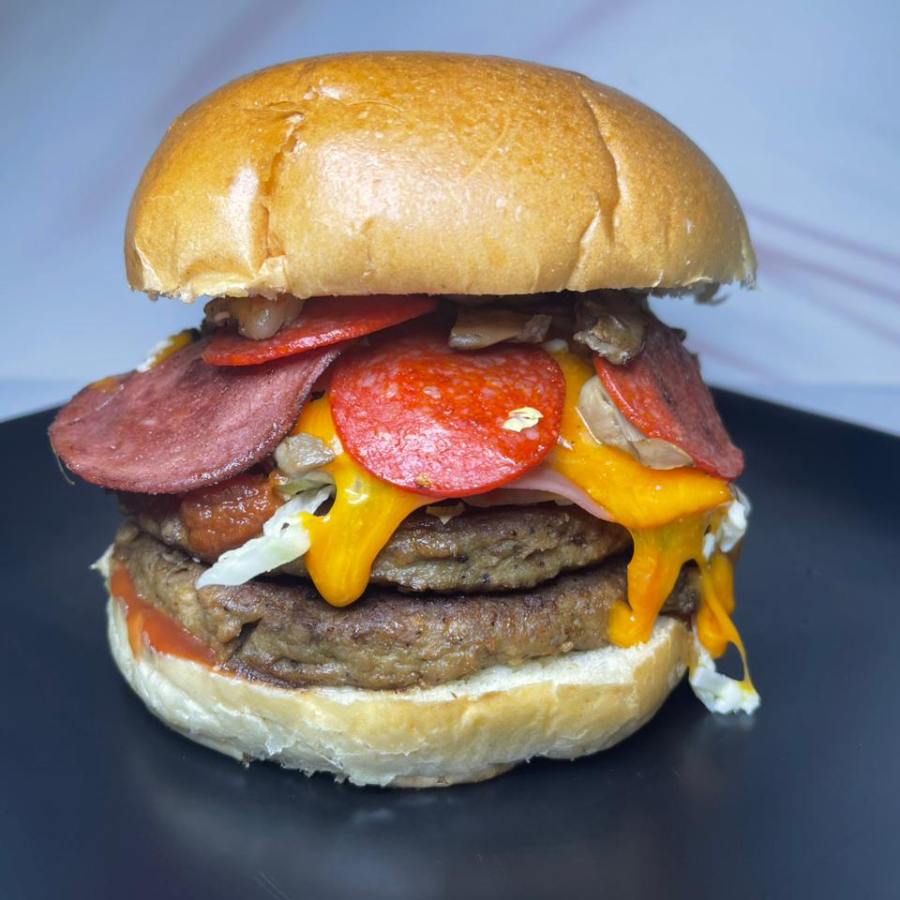 Doble carne, salami, pepperoni, champiñones, salsa de tomate, jamón, queso Daysi, queso manchego, cebolla roja, 1 rebanada de tomate, romanita, mayonesa y cátsup y 100 g de papas a la francesa.