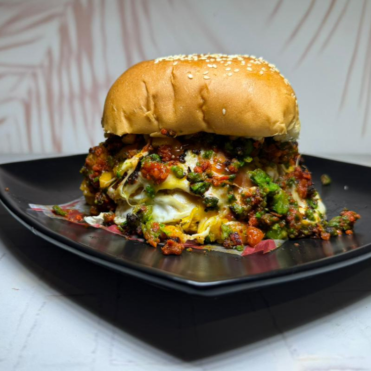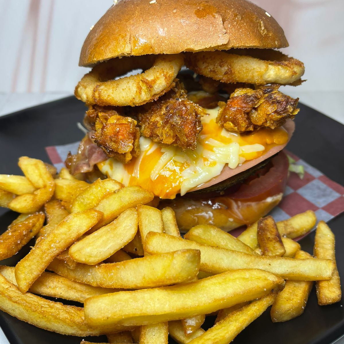 Doble carne a elegir, jamón, queso manchego, queso Daysi, mozzarella, 1 huevo estrellado, chorizo rojo y verde, cebolla roja, 1 rebanada de tomate, mayonesa y cátsup y 100 g de papas a la francesa.