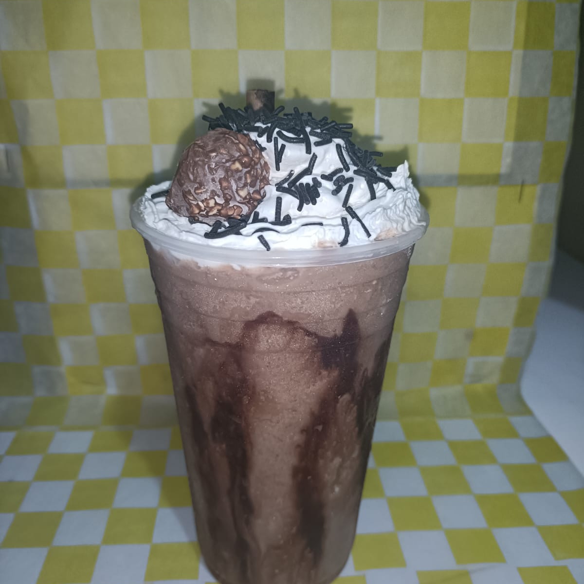 Batido de leche deslactosada , cafe y hielo con chocolate ferrero Rocher.