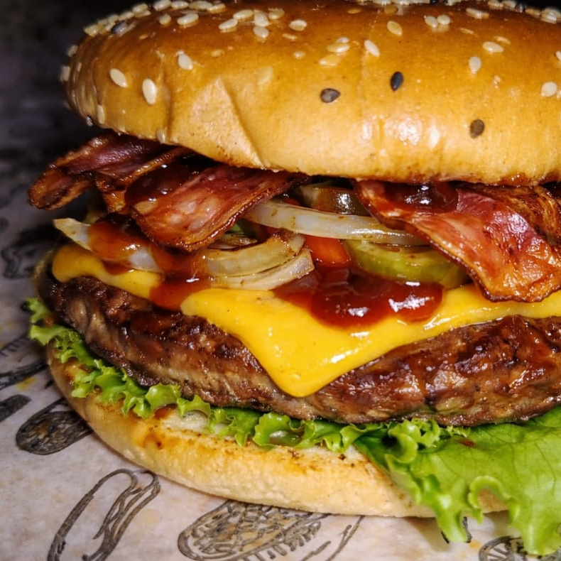 Jugosa carne a la parrilla coronada con doble capa de queso derretido que se funde en cada mordida. Crujiente tocino dorado, un toque generoso de salsa BBQ con ese sabor ahumado irresistible, y el balance perfecto de lechuga fresca, jitomate, cebolla y pepinillos. Todo dentro de un pan suave con ajonjolí ligeramente tostado. Una combinación intensa, sabrosa y simplemente inolvidable