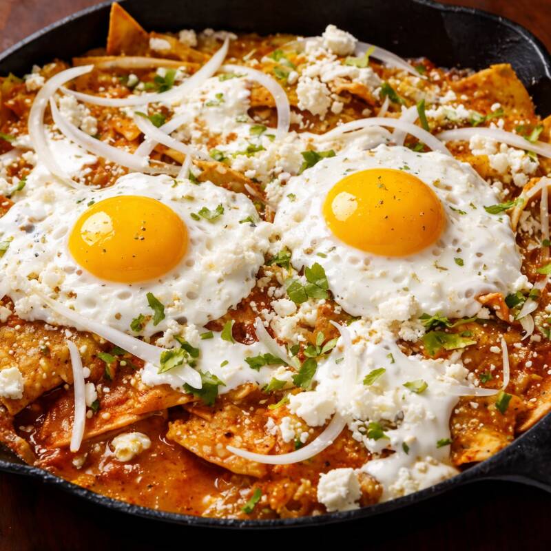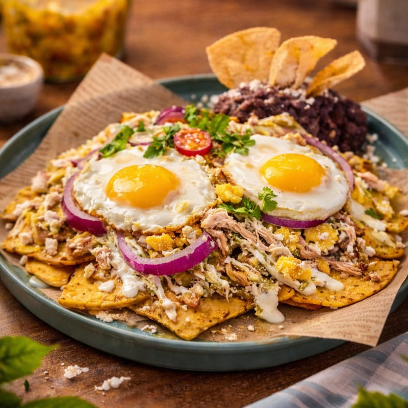 Crujientes totopos bañados en deliciosa salsa roja, acompañados de pollo deshebrado y huevos estrellados al momento. Servidos con crema, queso fresco y un toque de cebolla morada para resaltar todos los sabores. Un desayuno completo, casero y lleno de tradición mexicana. 🌿🍳