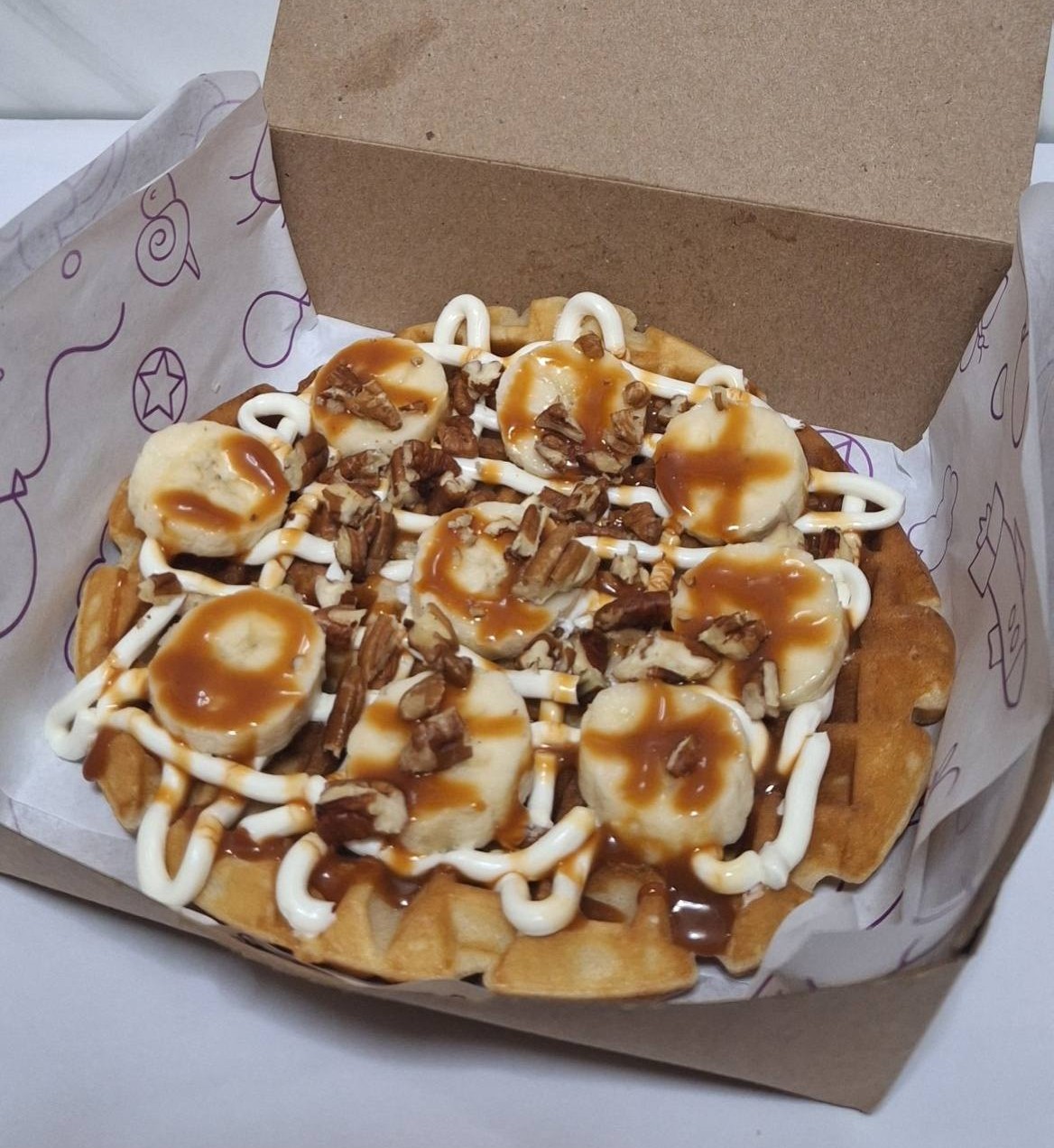 Wafle brlga con queso philadelphia, rebanadas de plátano,crujiente nuez coronado con cajeta