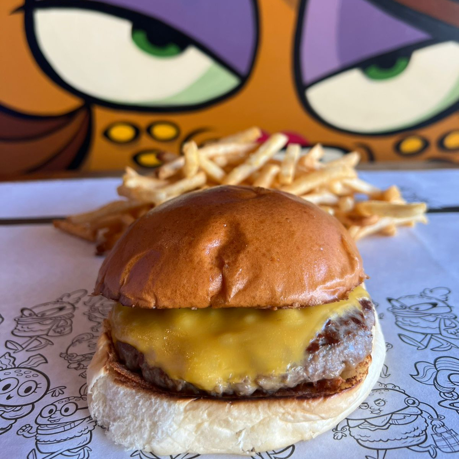 Carne USDA black angus, queso americano, 3 aros de cebolla, lechuga y tomate.