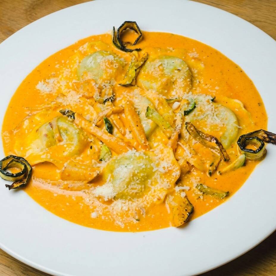 Ravioli relleno de ricotta y espinaca en salsa rosè con verduras salteadas a la julienne.