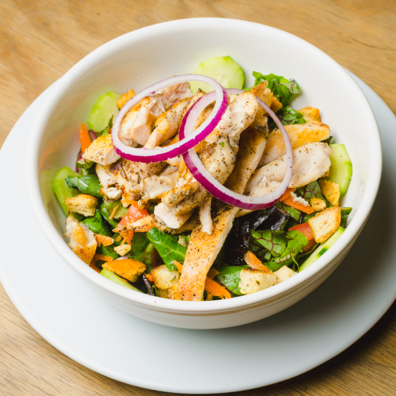 Ensalada con Lechuga mix, tomate, pepino, elote, zanahoria, crutones, pesto de perejil y pollo a la plancha