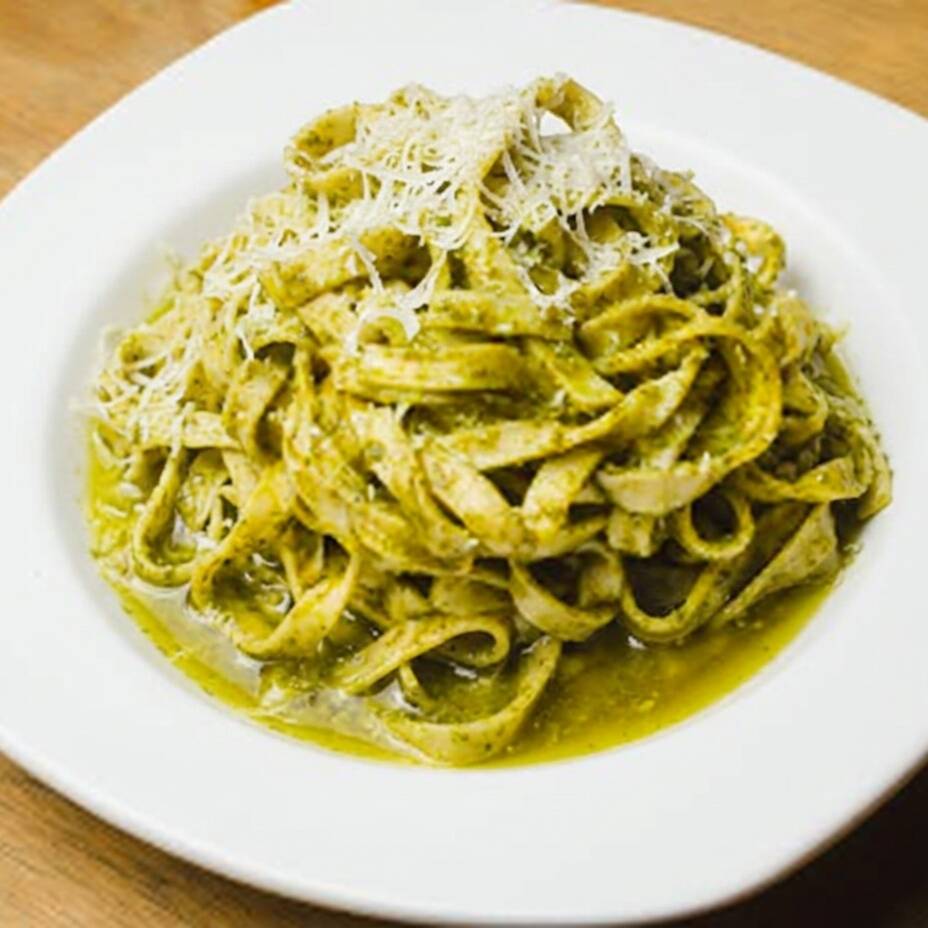 Pasta fetuccini con pesto de albahaca local, pecorino, aceite de oliva, nueces y ajo.