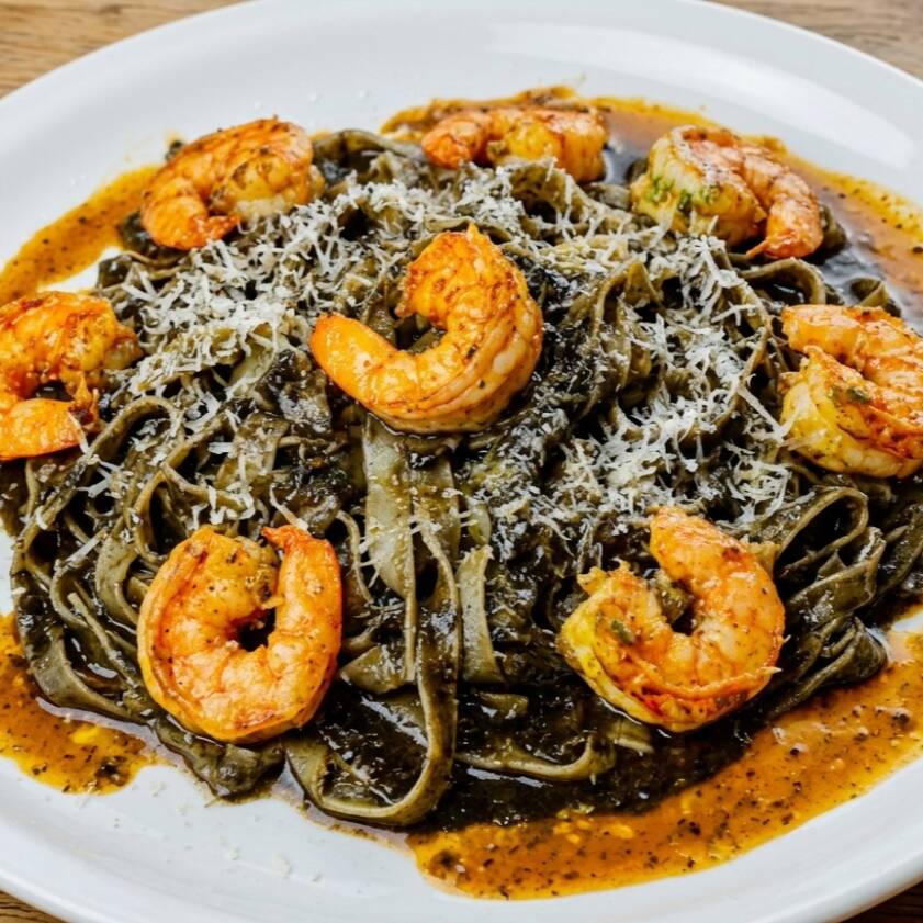 Pasta fettuccini nero con camarones de celestún, flameados al vino blanco y sautèes a la naranja agria, salsa de tomate y pecorino romano.
