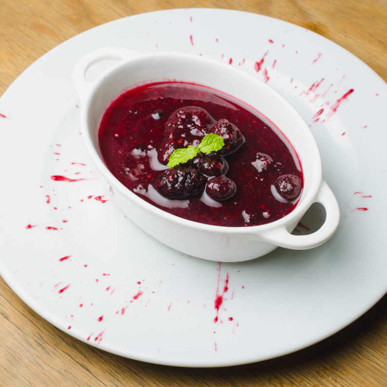 Panacotta cremosa con salsa de frutos rojos.