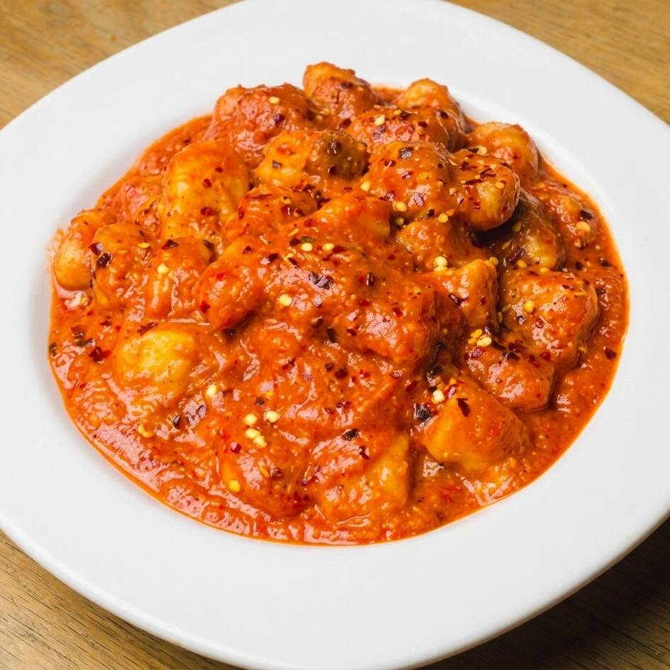 Pasta gnocchi con salsa de tomate, peperoncino y pimienta.