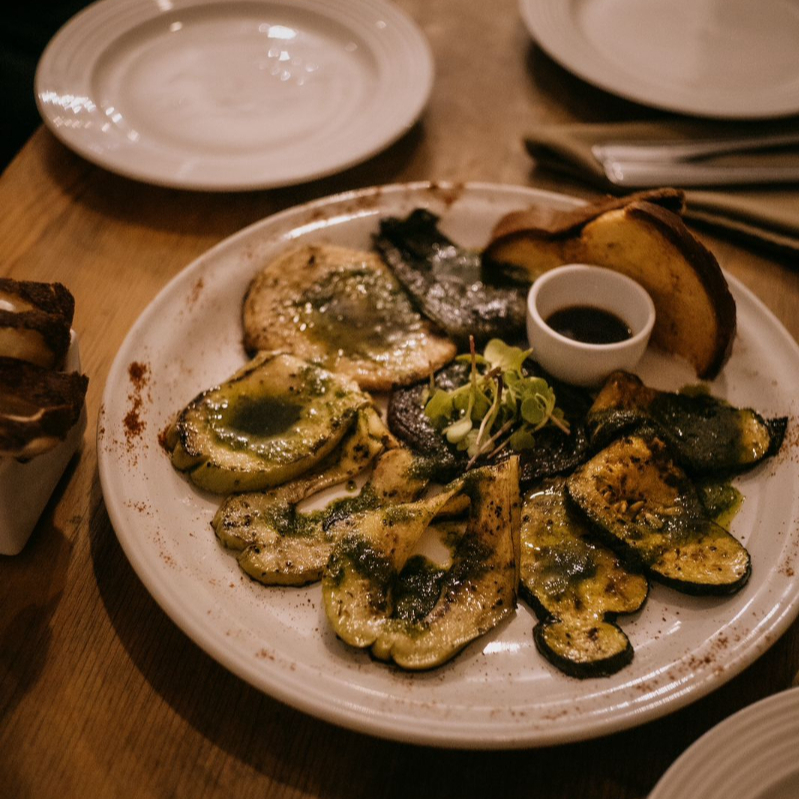 Calabaza local, jícama, chayote, chile poblano, cebolla morada a la parrilla marinada con aceite de oliva, perejil y cilantro.