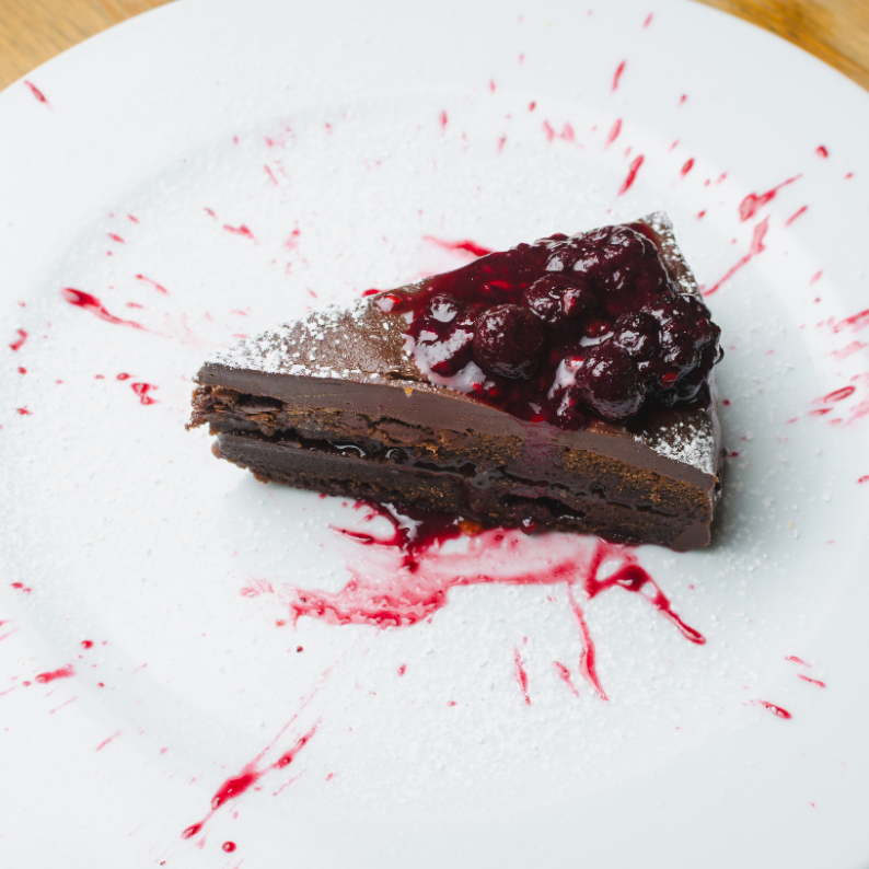 Pastel de chocolate con frutos rojos y azúcar glass espolvoreado.