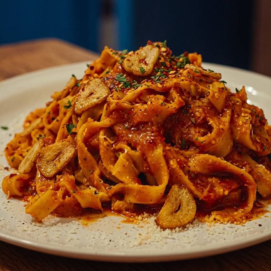 Pasta fettuccine con salsa de tomate, peperoncino y pimienta.