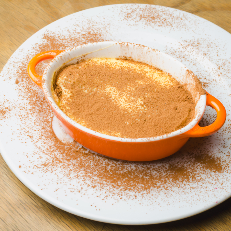Clásico postre italiano con capas de soletas bañadas en café, crema de mascarpone y cacao espolvoreado.