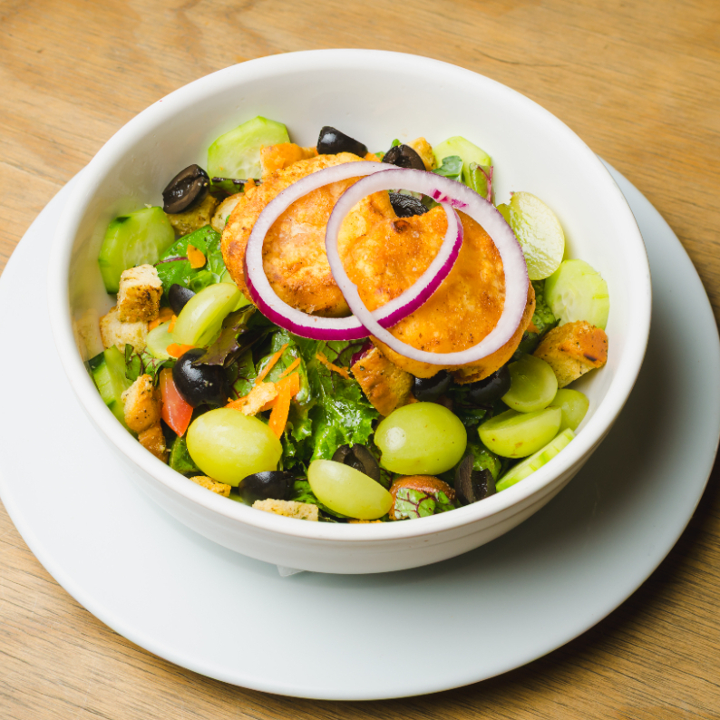 Ensalada con Lechuga mix, tomate, aceituna, pepino, uva, crutones, pesto albahaca, 2 croquetas de queso de cabra