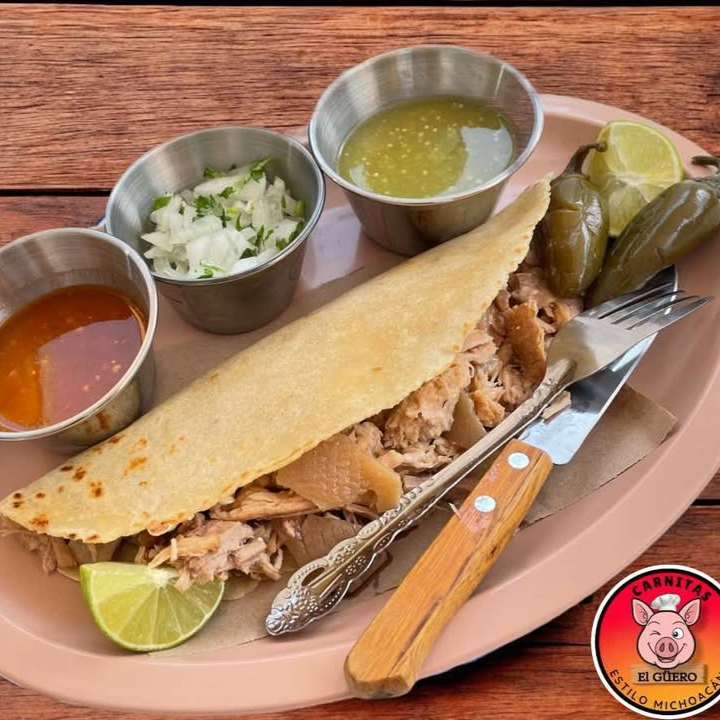 tortilla echa a mano de 40cm que se pone al comal con queso de hebra fundido y se agrega deliciosa carne, cueritos, buche u orejita.