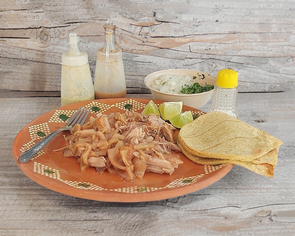 200g de carnitas solo maciza sin cuerito ni gordito, incluye complementos 5 tortillas, salsa verde, roja, cebolla, cilantro y limón