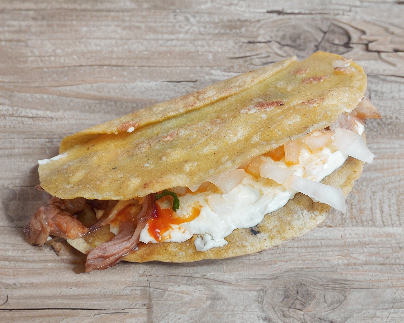 Tortilla de maiz, doradita, con queso y carnitas maciza