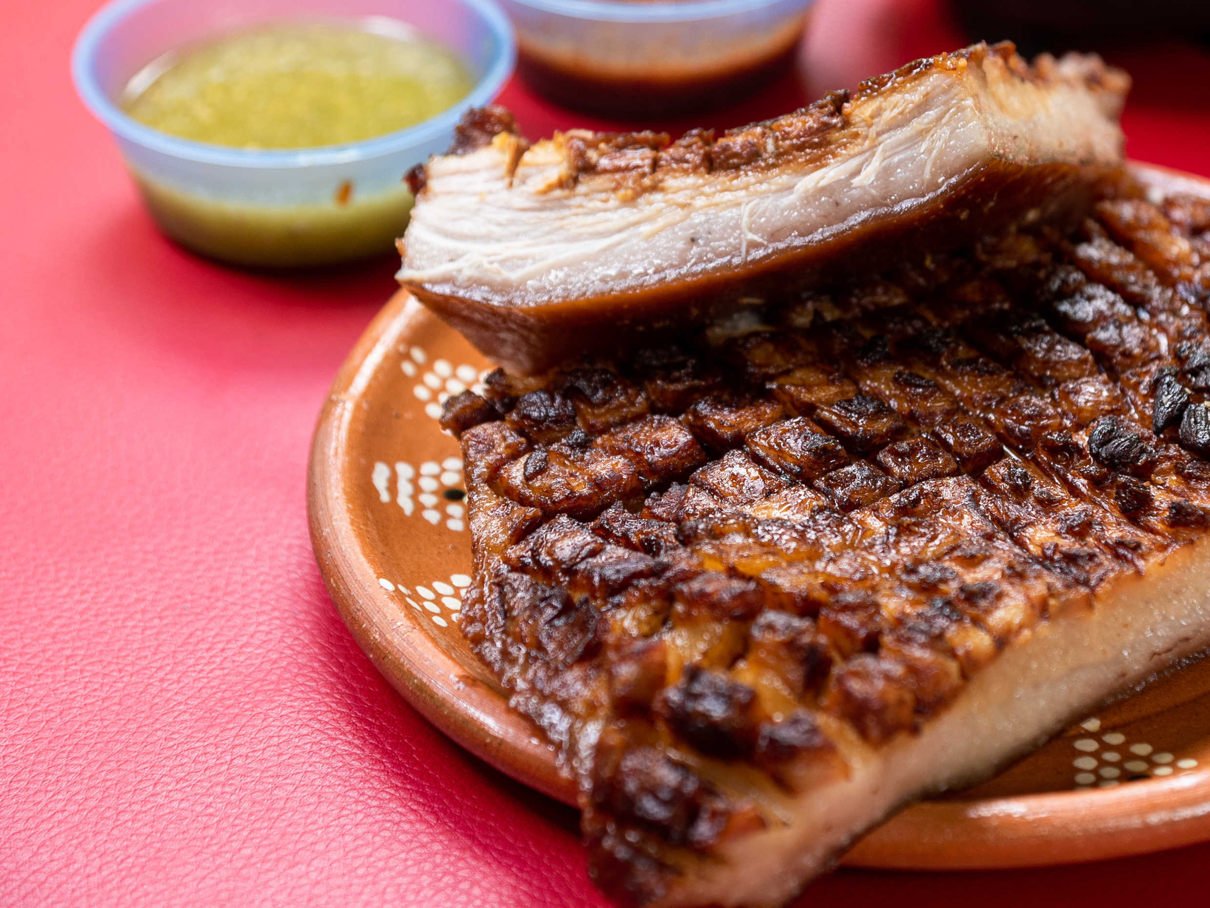 Pieza de chamorro acompañado con cebolla, salsa roja y verde.