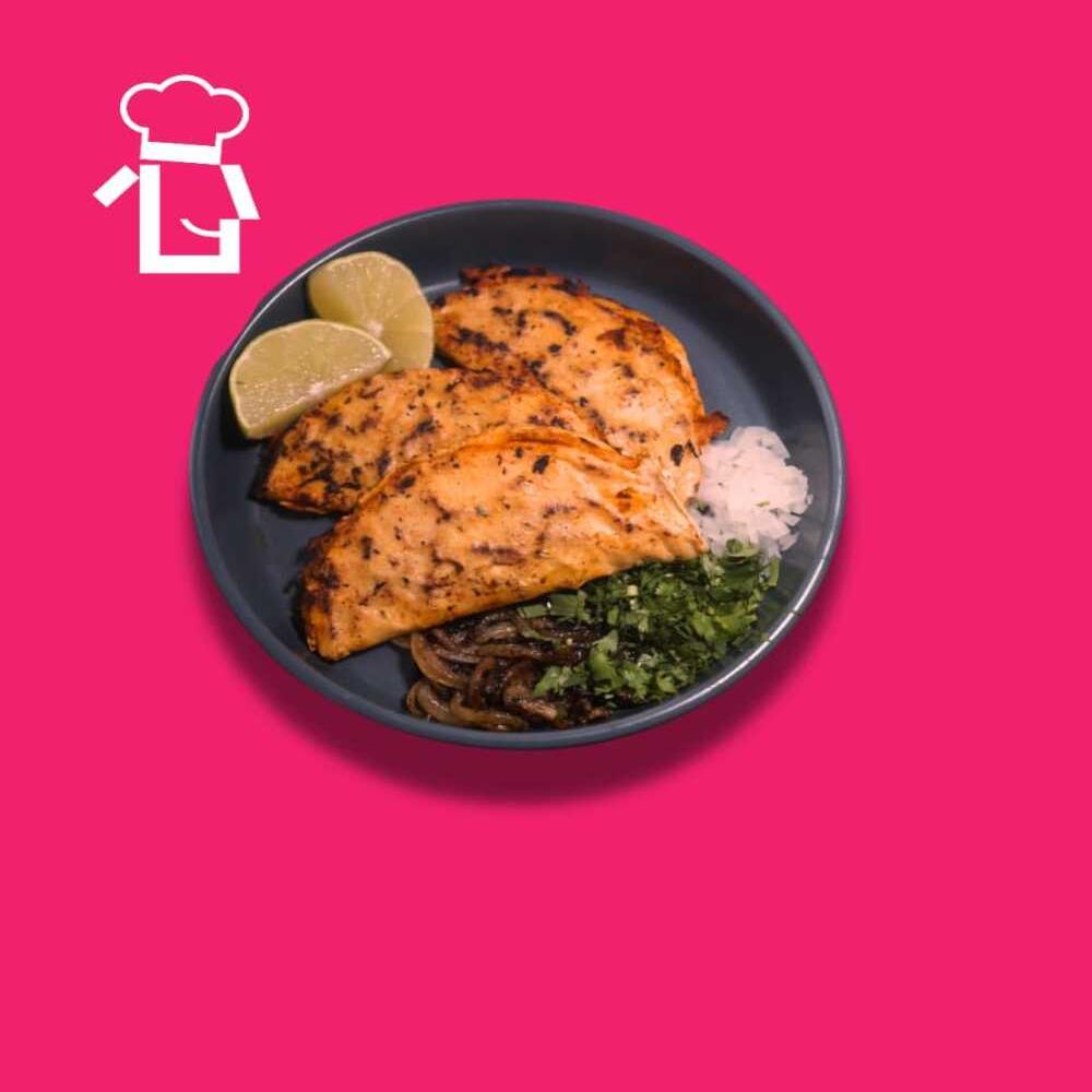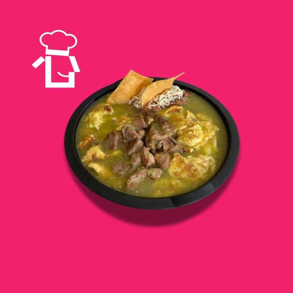 Preparado con totopos hechos en casa, bañados en salsa de tu elección, acompañado con pierna de cerdo adobada estilo jalisco , frijolitos refritos, crema, queso y cebolla.
