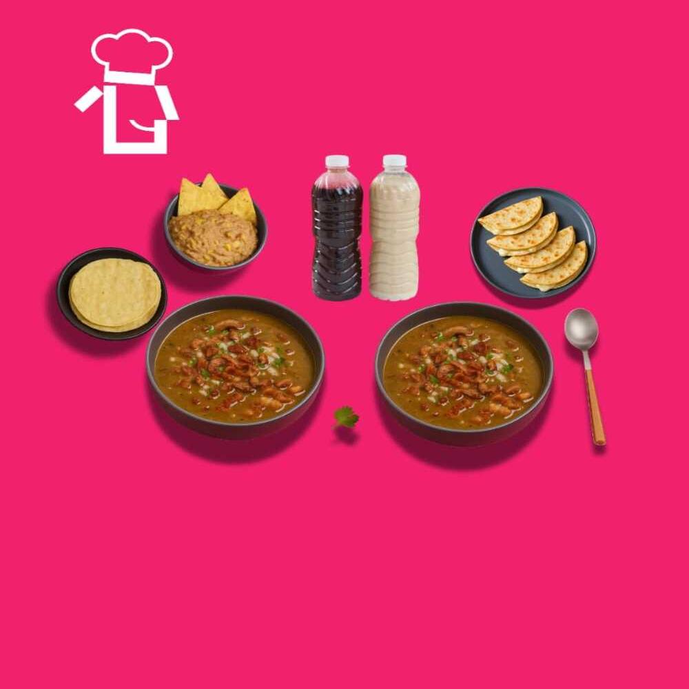 2 carnes en su jugo de 140 grs c/u acompañado de frijoles de la olla, tocino, cebolla, cilantro, limón, tortillas de maíz, 4 quesadillas, totopos, 300 grs de frijoles refritos con elote y 2 aguas a elección.