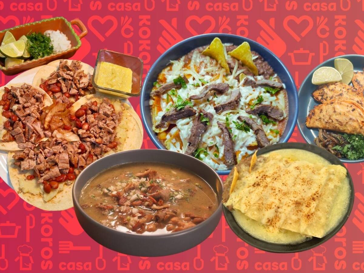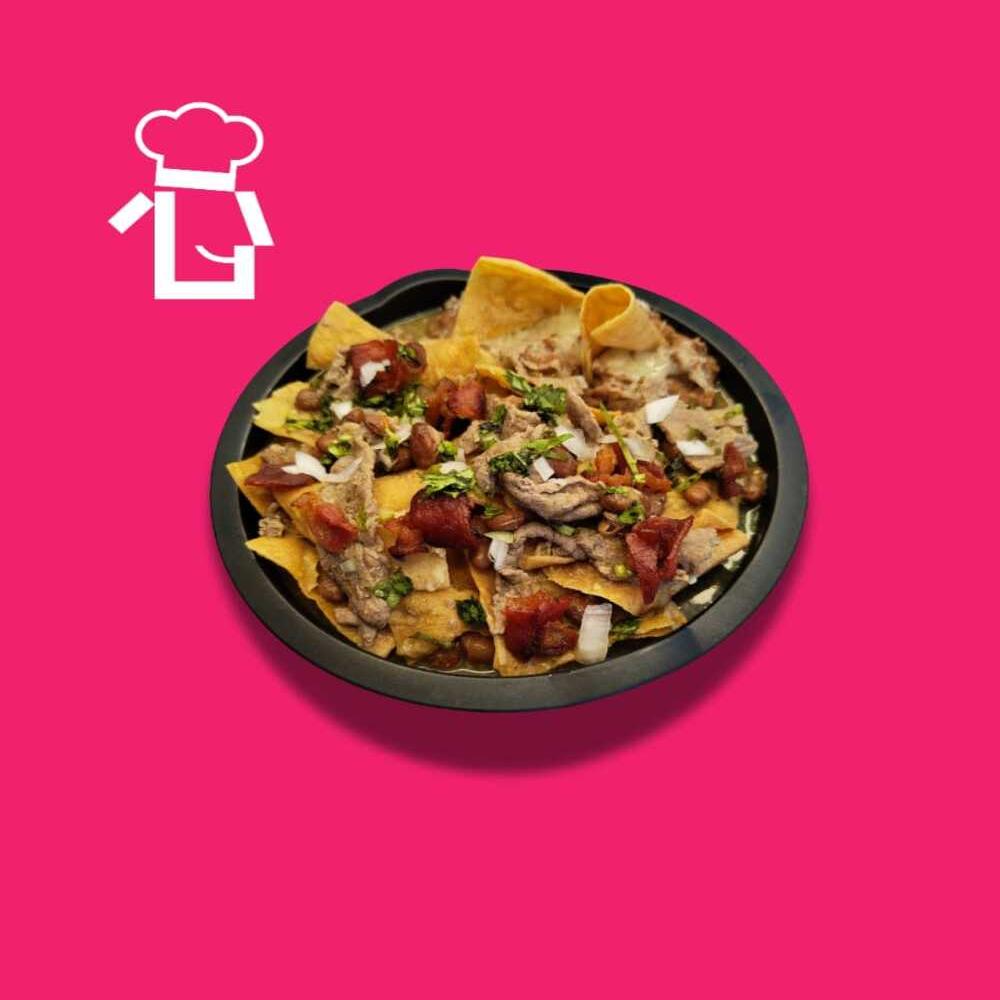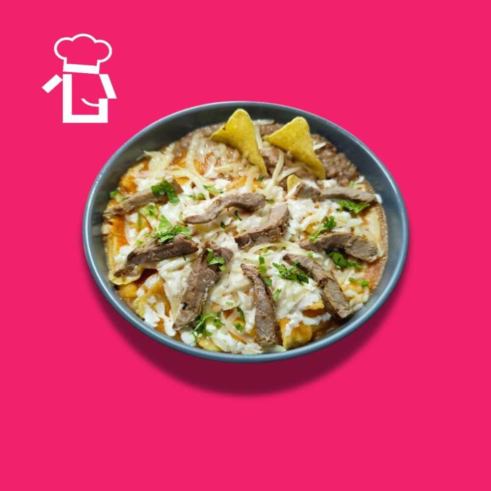 Preparado con totopos hechos en casa, bañados en salsa de tu elección. Acompañado con arrachera marinada, frijolitos refritos, crema, queso y cebolla