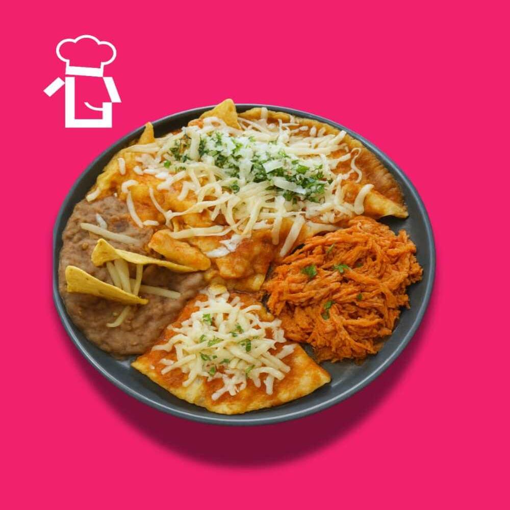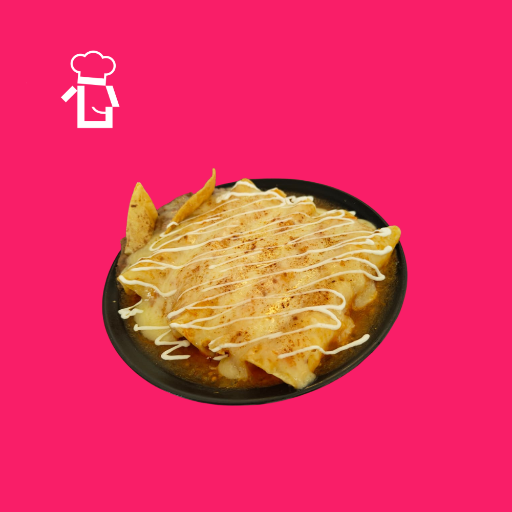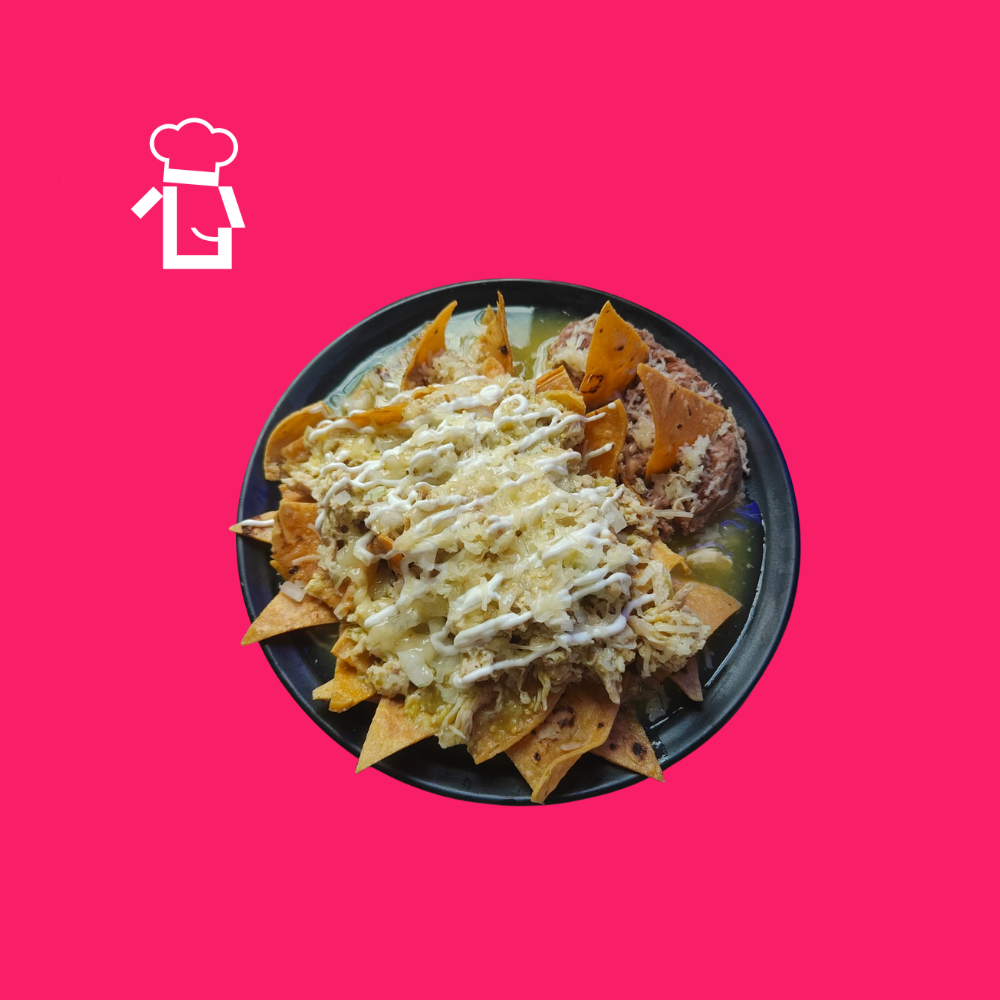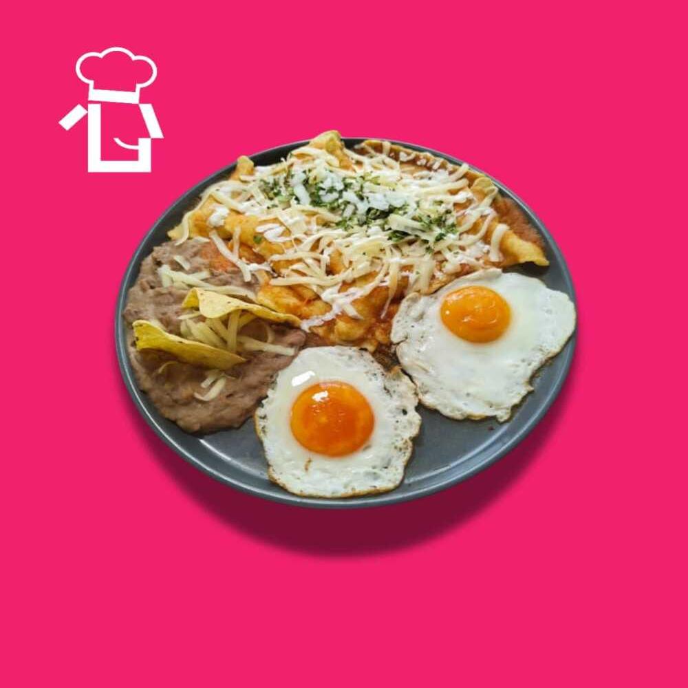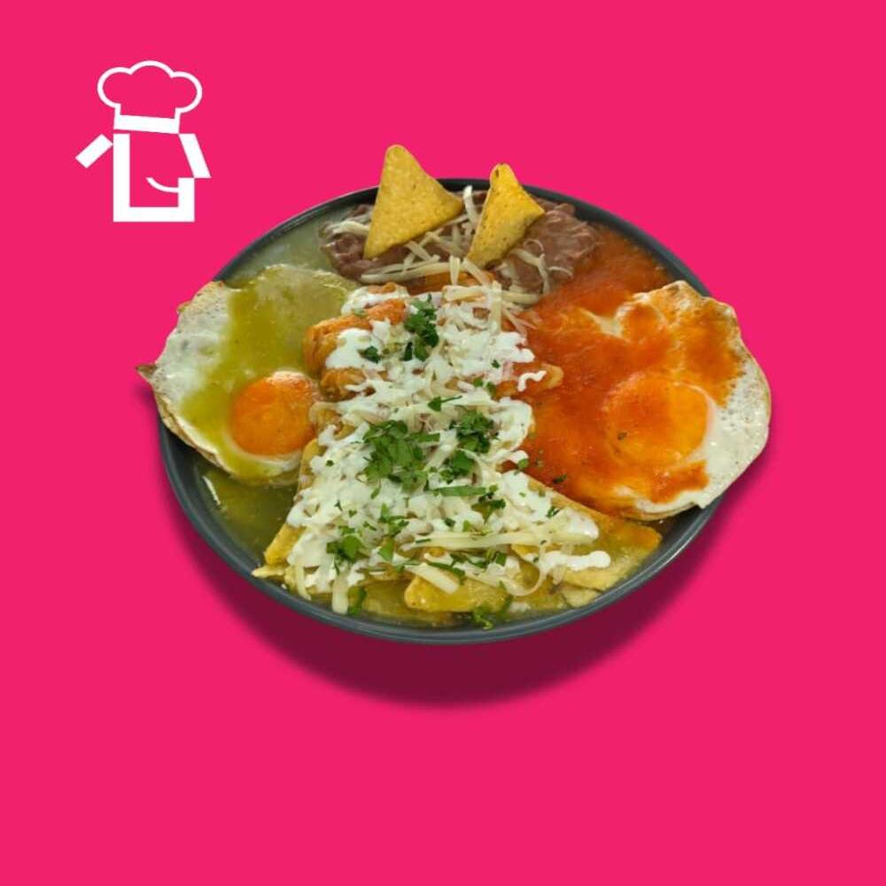 Preparado con totopos hechos en casa, bañados en salsa de tu elección. Acompañado con 2 huevos estrellados o revueltos, frijolitos refritos, crema, queso y cebolla