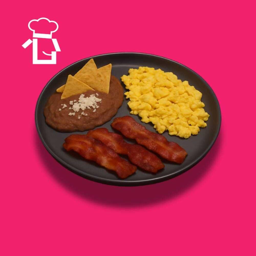 2 huevos revueltos con 2 tiras de tocino y frijolitos refritos