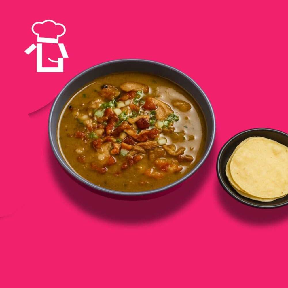 Preparado con totopos hechos en casa bañados con carne en su jugo