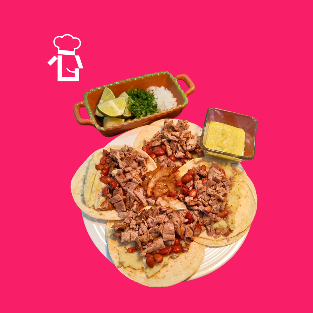 Órden de 4 tacos de asada con frijolitos de la olla, papa y cebollita caramelizada