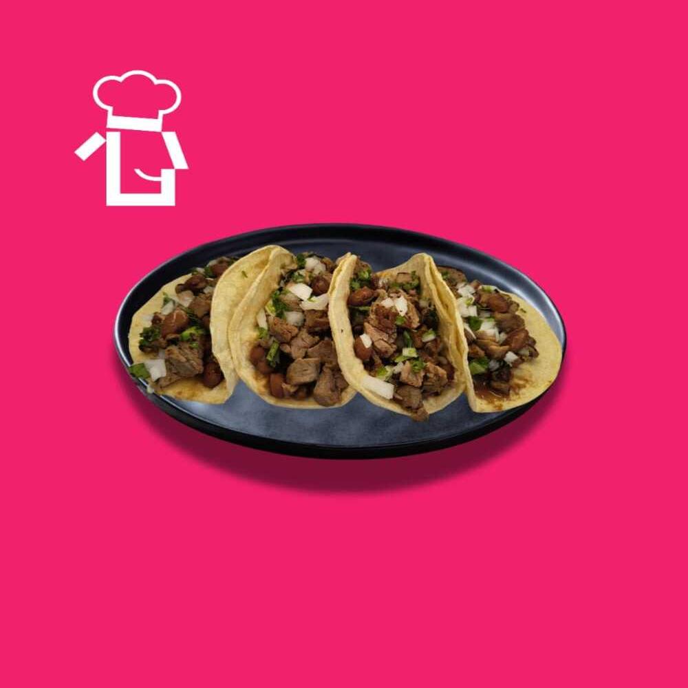 Órden de 4 tacos de arrachera con frijolitos de la olla y cebollita caramelizada